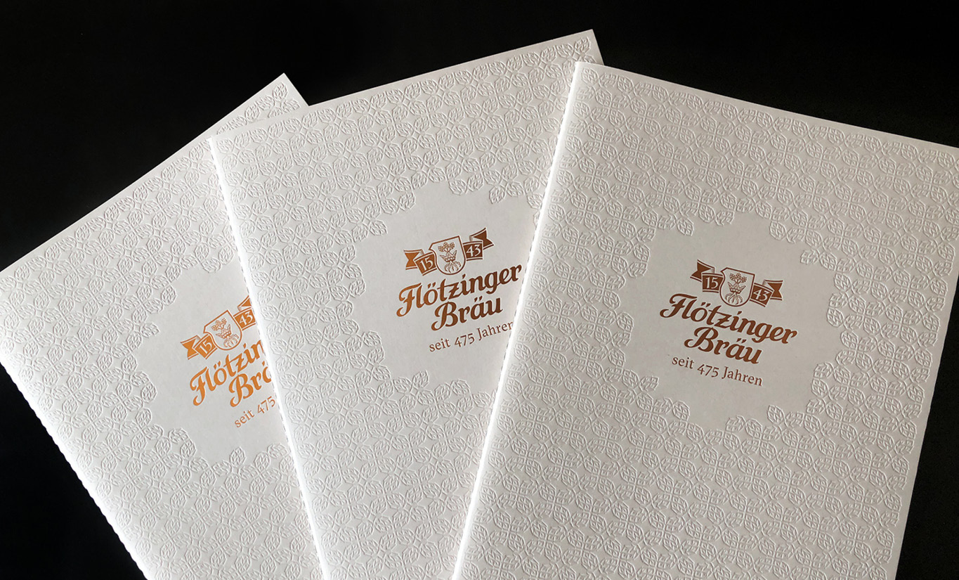475 Jahre Flötzinger Bräu in Rosenheim. Das feiern wir! Undzwar mit einer Imagebroschüre der außergewöhnlichen Art. Studio Frau zeichnet sich verantwortlich für Konzept und Gestaltung. Im Fokus steht dabei eine hochwertige Veredelung. Heißfolien- und Blindprägung sowie eine Fadenbindung lassen diese Broschüre zu einem kleinen Schmuckstück werden. Darüber hinaus erhielten alle Gäste ein Notizbuch im gleichen Design.